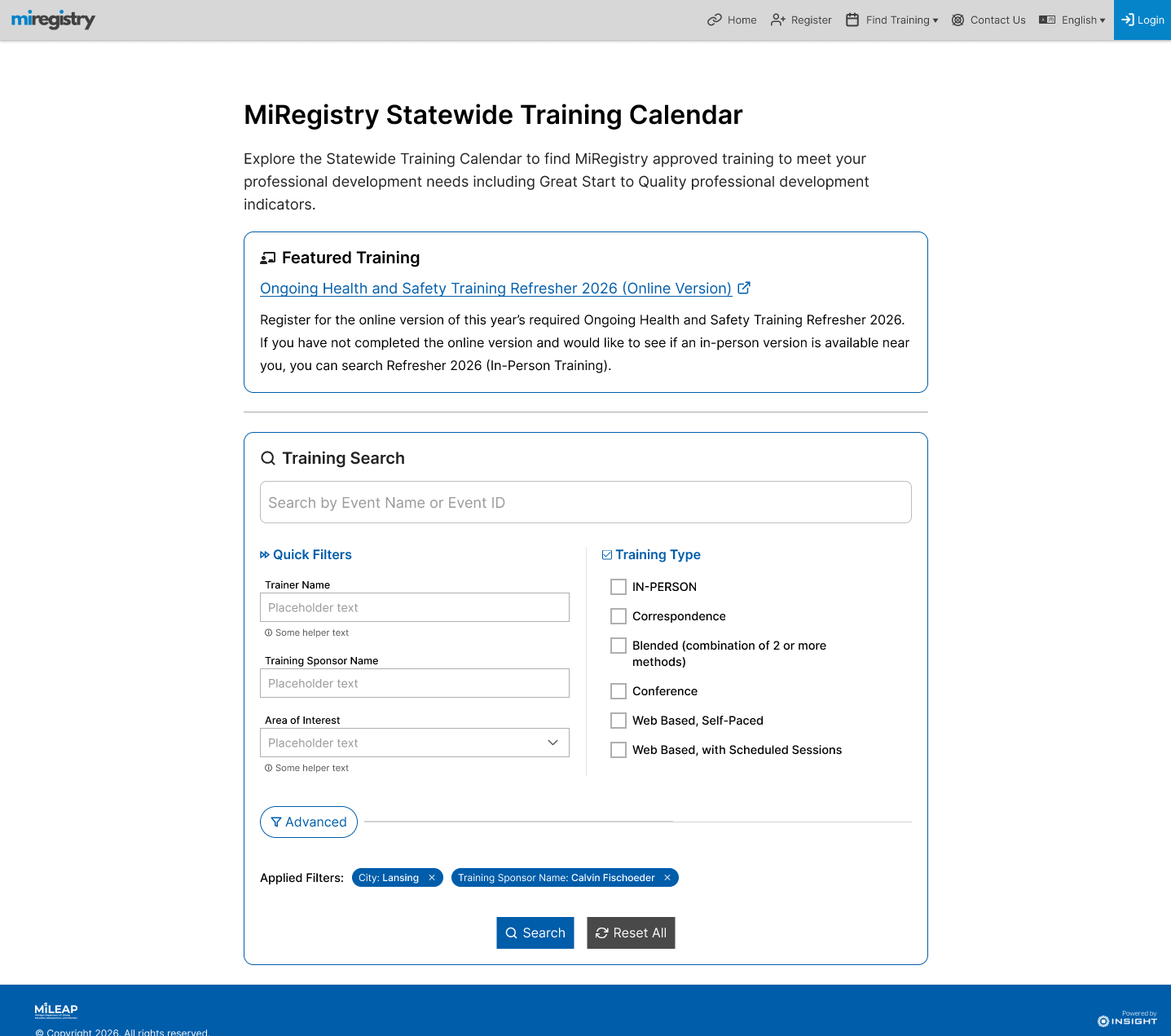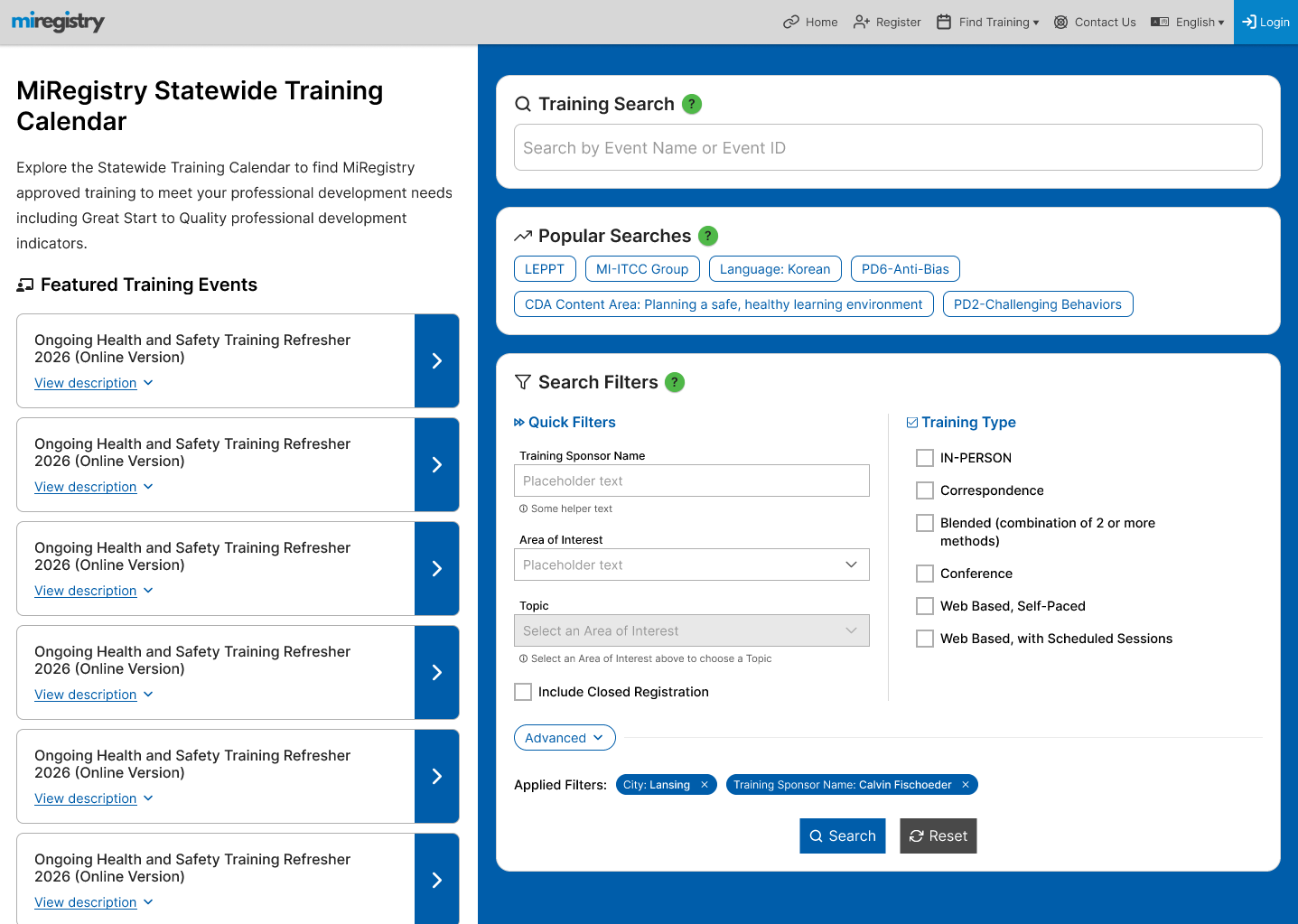 The Training Calendar is a public website that thousands of early childhood professionals in the state of Michigan rely on to find and register for training events that support credentialing and state-level compliance. Over time, incremental enhancements and one-off feature requests caused the interface to become cluttered and difficult to navigate, especially for users who simply needed to locate the right training quickly. Michigan partnered with my team to simplify this experience. I led the redesign from the ground up, using design iterations to clarify ambiguous requirements, align stakeholders, and ultimately create a streamlined search workflow that better supports users' goals.